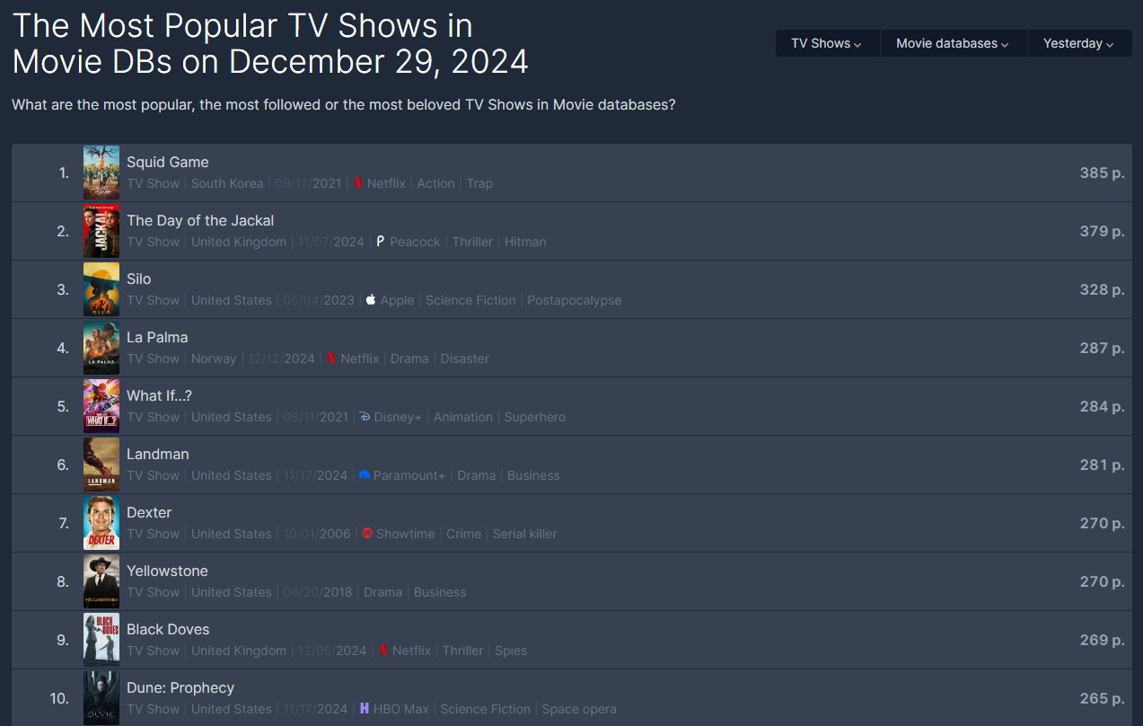 The Most Popular TV Shows in Movie DBs on December 29, 2024 • FlixPatrol
