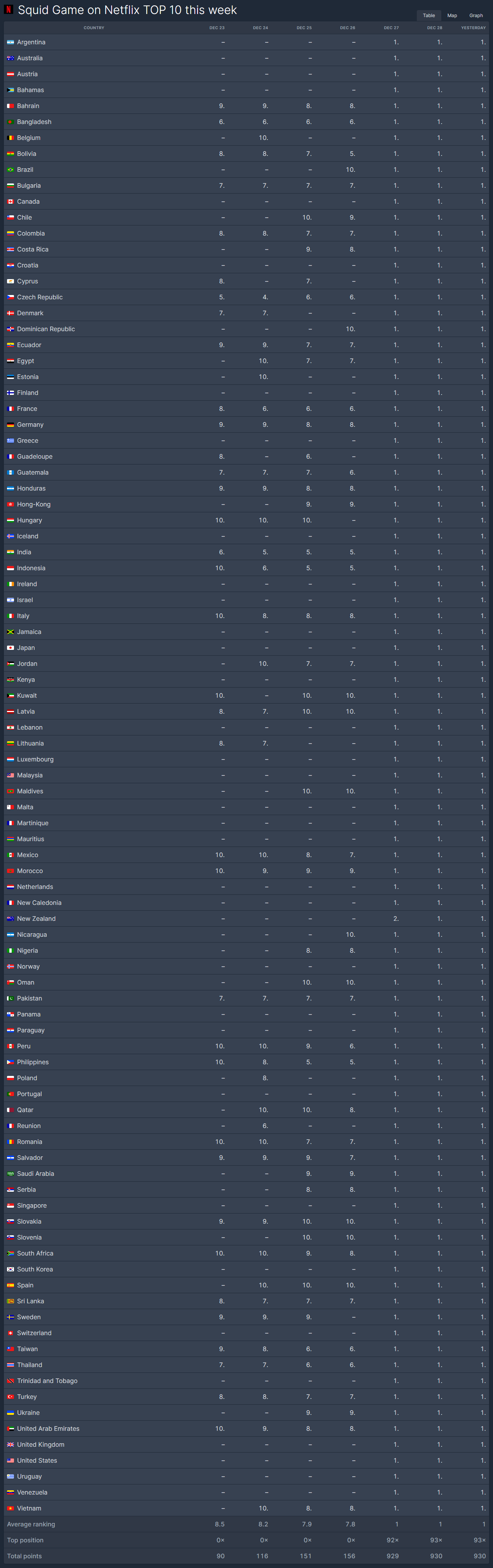 - 글로벌 톱10 랭킹: "오징어게임 2"가 몇 개국에서 1위를 차지했는지 확인.