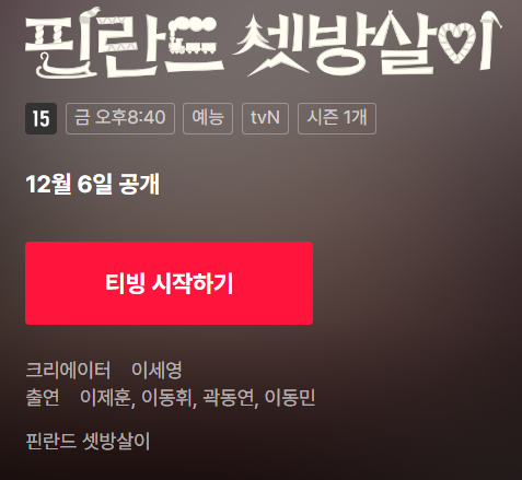 tvN '핀란드 셋방살이'는 12월 6일 저녁 8시 40분 첫 방송됩니다. 배우들의 새로운 매력과 감동적인 이야기를 놓치지 마세요! 본방사수 필수!